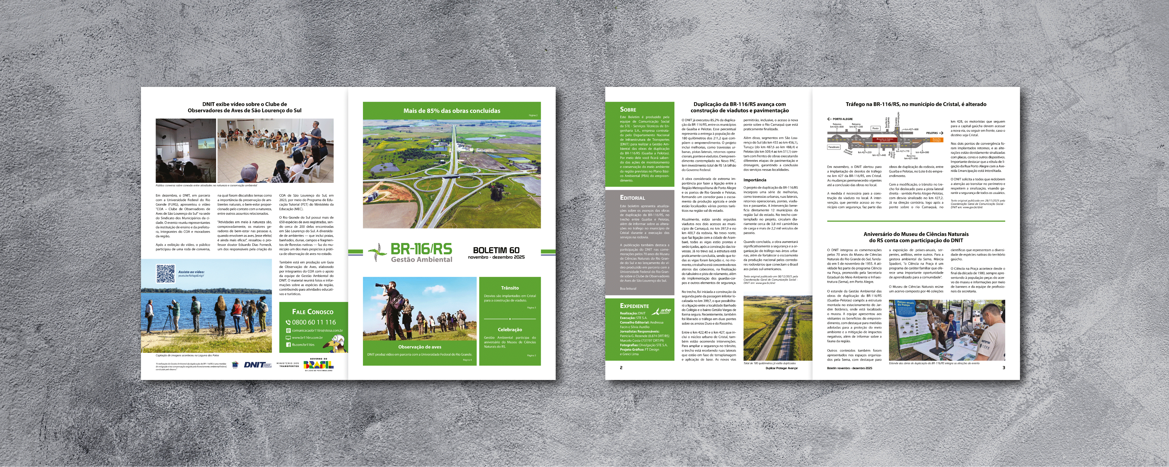 Já está disponível nas redes virtuais a 60ª edição do Boletim da BR-116/RS, referente aos meses de novembro e dezembro de 2025, trazendo informações sobre as obras de duplicação e dos Programas Ambientais executados no empreendimento. A produção do material é uma iniciativa do Departamento Nacional de Infraestrutura de Transportes (DNIT), por meio da Gestão Ambiental, e visa a manter a população informada sobre as atividades realizadas na região.
