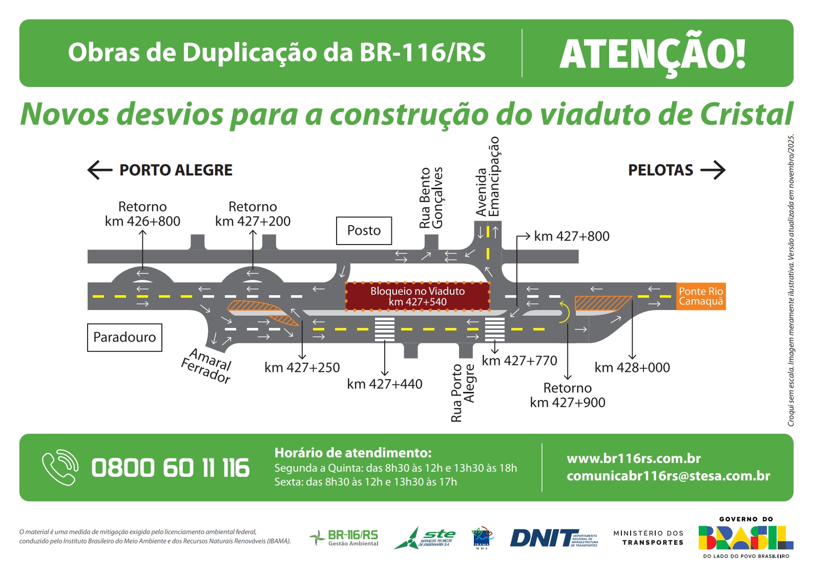 O Departamento Nacional de Infraestrutura de Transportes (DNIT) alerta para os desvios no tráfego da BR-116/RS, em Cristal, no km 427, a partir desta segunda-feira (1°), às 14h.
