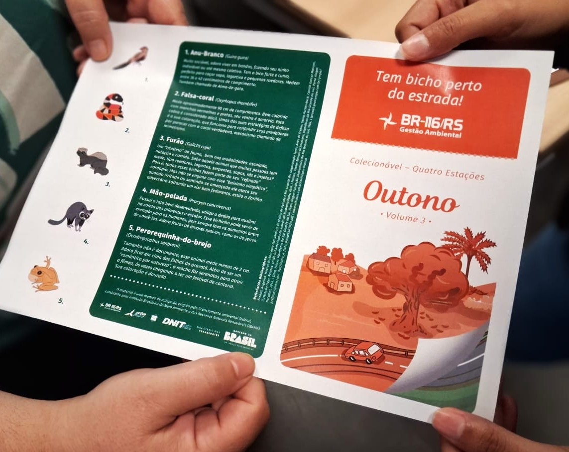 Para alertar sobre esses riscos, o Departamento Nacional de Infraestrutura de Transportes (DNIT), por meio da Gestão Ambiental das obras de duplicação da BR-116/RS (Guaíba – Pelotas), produziu a cartilha “Tem bicho perto da estrada”. O material orienta condutores a redobrar os cuidados ao trafegar, especialmente em trechos onde há maior circulação de fauna, e reforça a importância de respeitar os limites de velocidade para evitar atropelamentos. De maneira didática, a publicação apresenta espécies características da região ao longo das estações do ano. No outono, recebem destaque o anu-branco, a falsa-coral, o furão, a pererequinha-do-brejo e o mão-pelada.